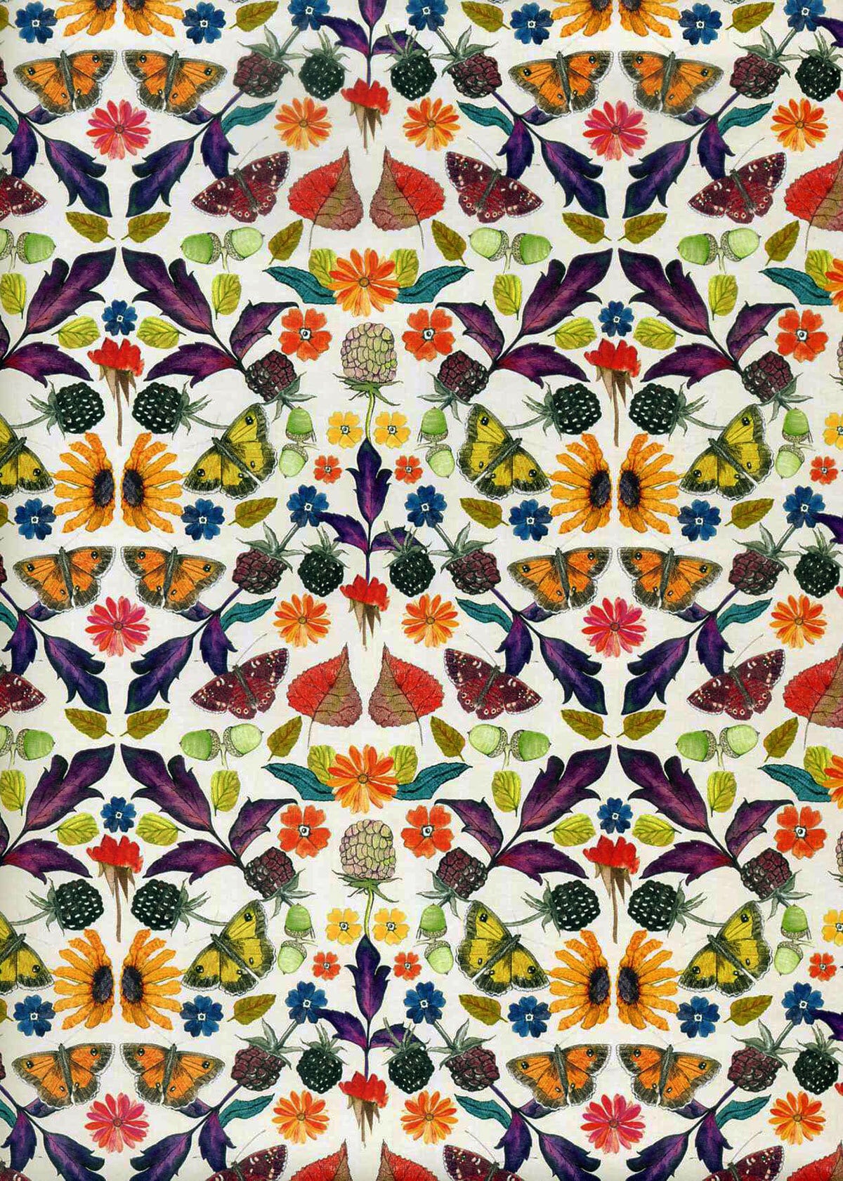 芋版画という昔ながらの手法を用いて、イギリスの変わりゆく季節の色や模様を表現しており独特の世界観に仕上がっています。
