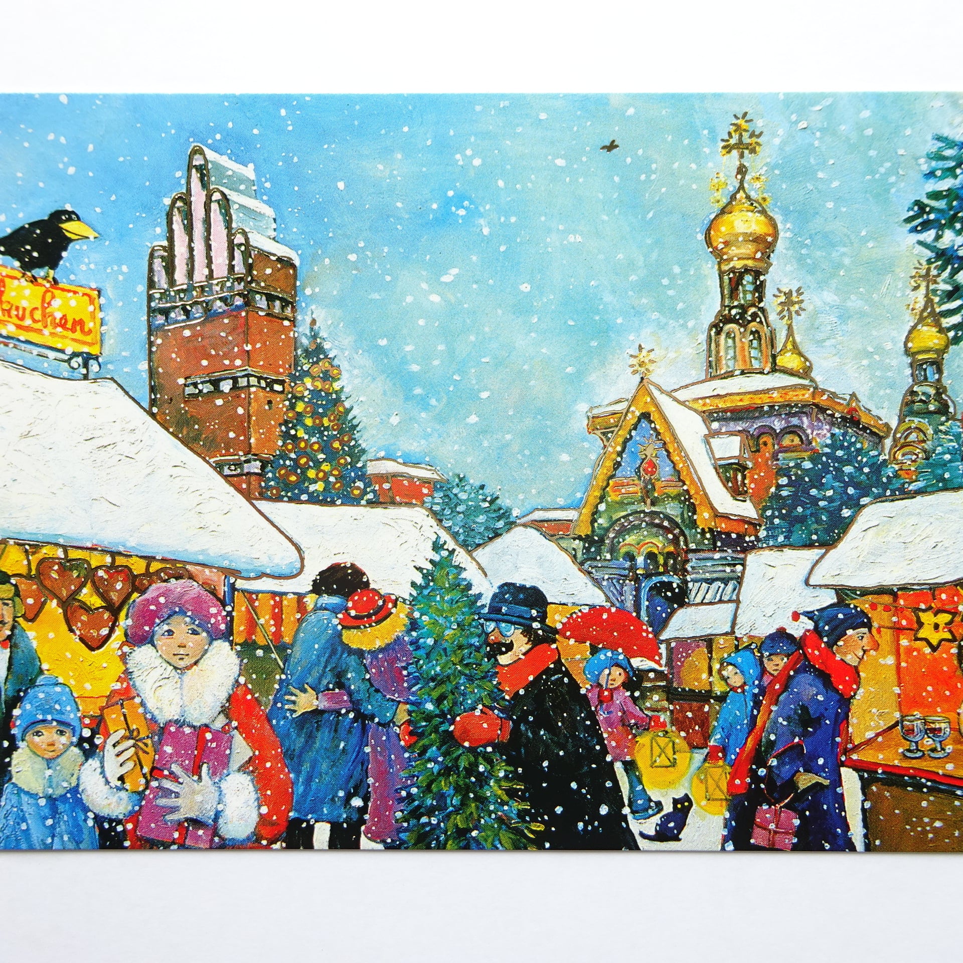 欧州の都市で開催されるクリスマスマーケットが描かれたポストカードです。