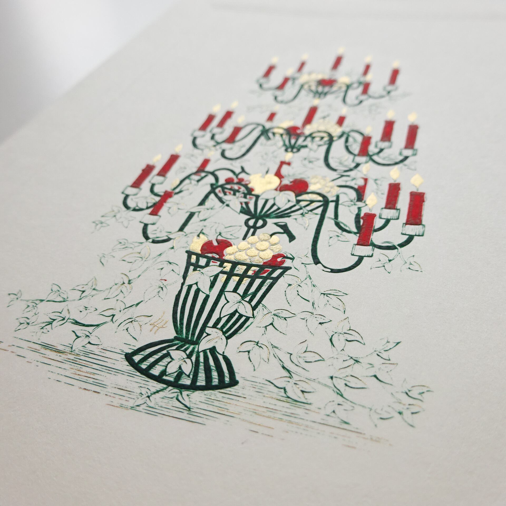 伝統的なクリスマスモチーフをエングレイビング(銅版印刷)の技法で印刷しています。
