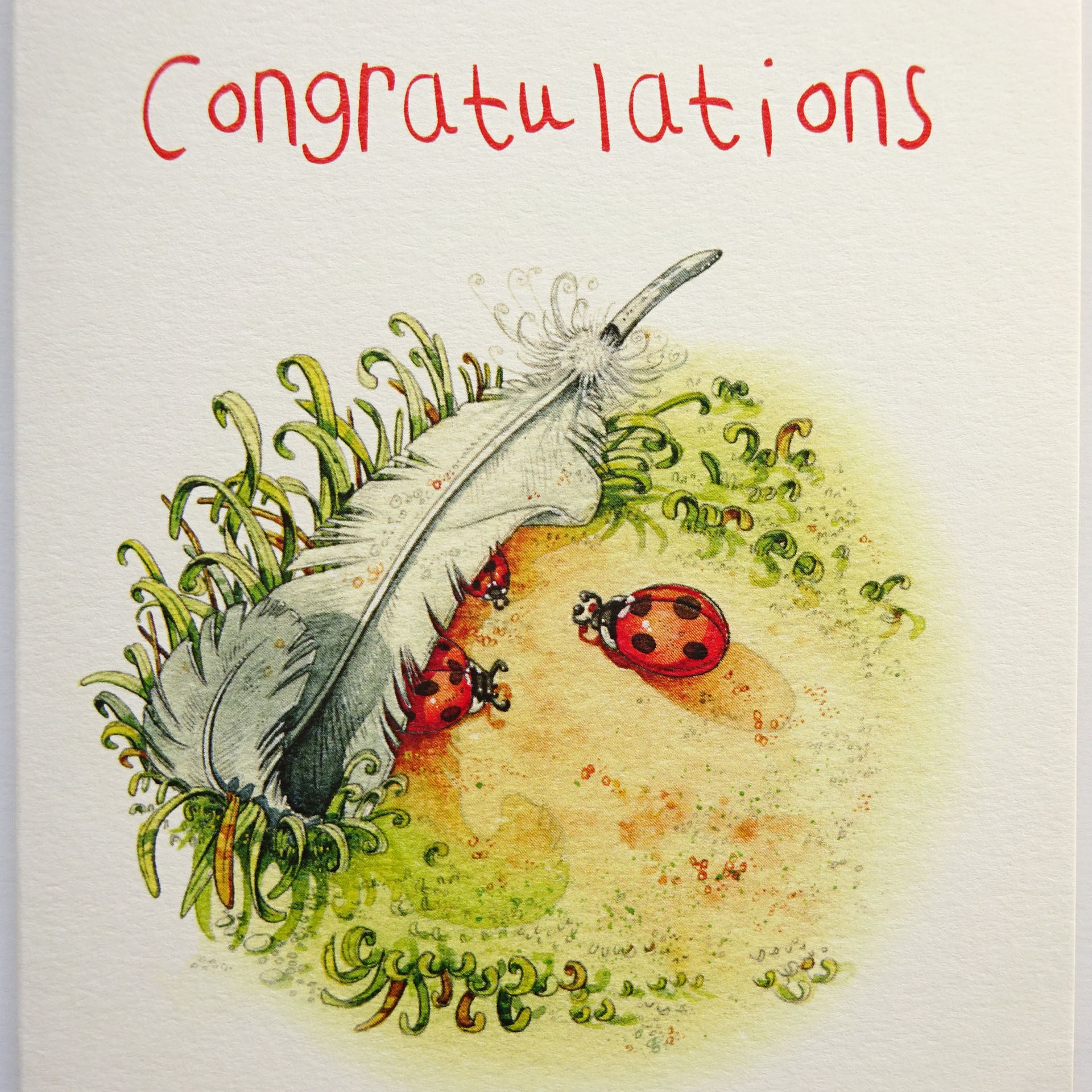 可愛いプリントがてんとう虫と飛躍や成功を意味する鳥の羽がプリントされたカード