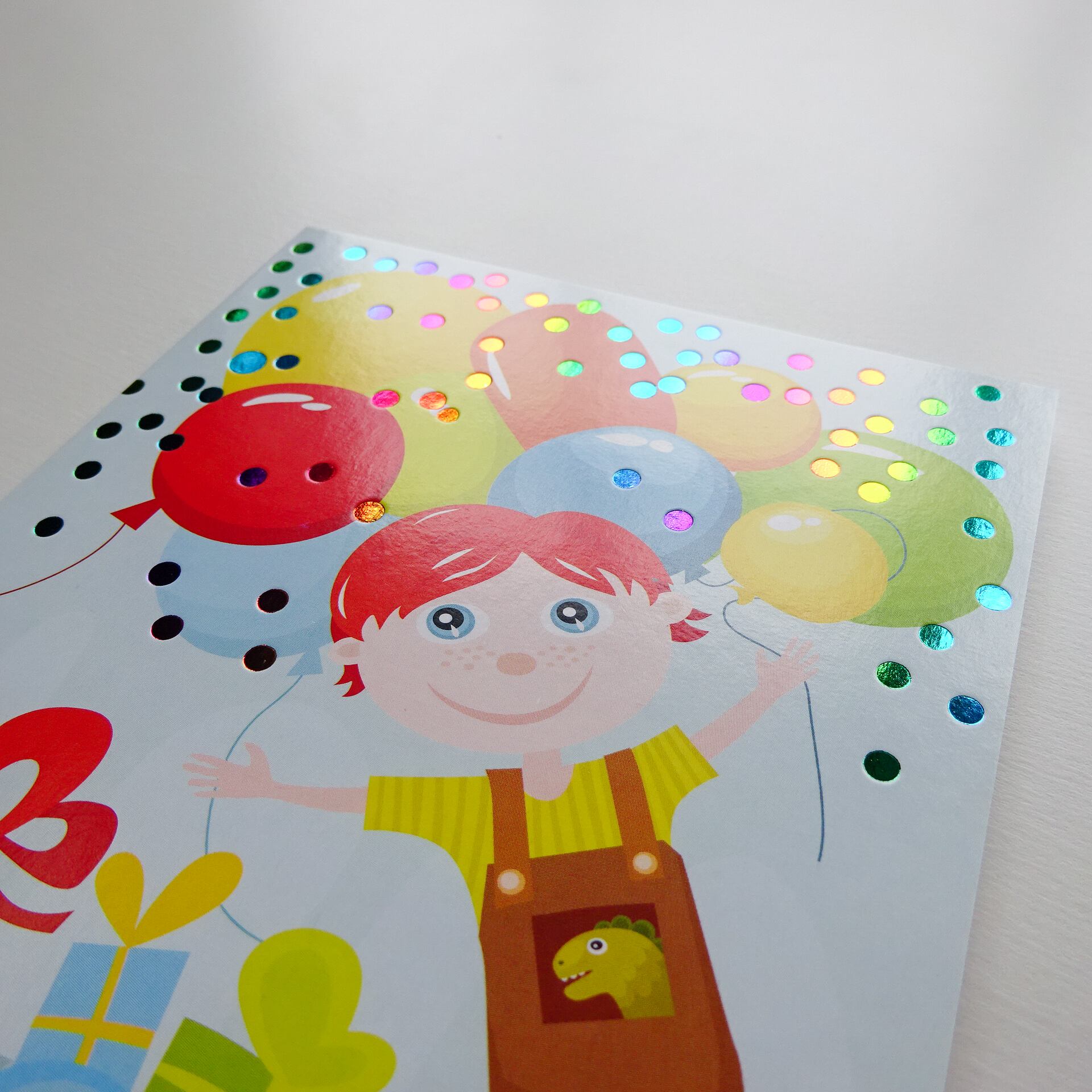 グリーティングカードの一部メタリックカラーの箔押し印刷とエンボス加工があります。